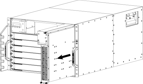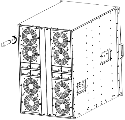 11. 拿起风扇盘,使风扇盘的松不脱螺丝位于操作者的右手边,将风扇盘与风扇插槽的开口边缘对齐,然后向设备主机方向推进风扇盘至底部。