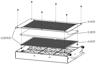 9. 将内网罩覆盖在过滤网上,然后使用步骤5中卸下的螺丝将内网罩和过滤网固定在外网罩上。