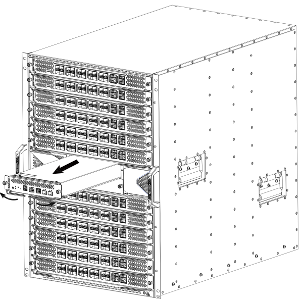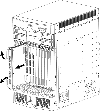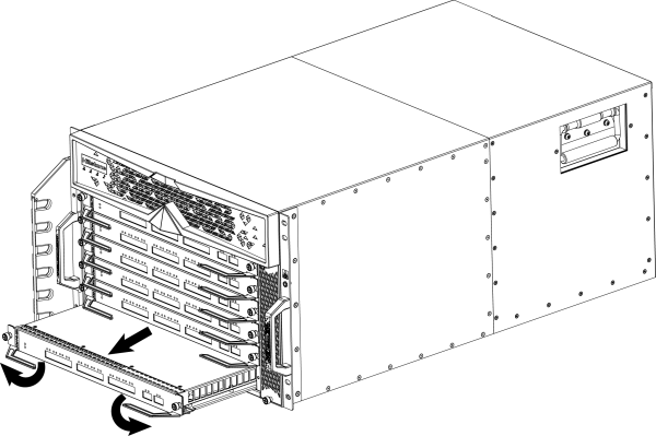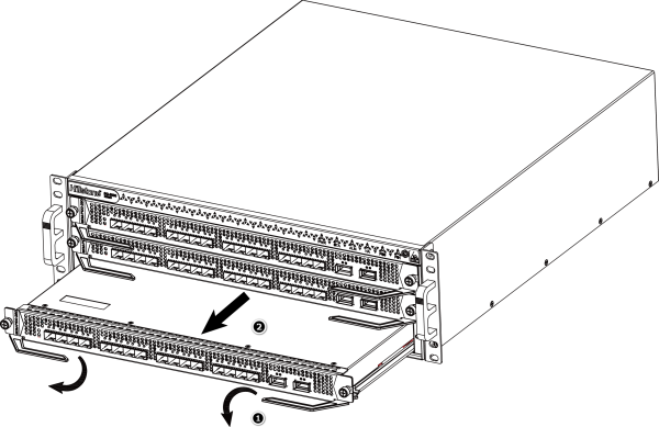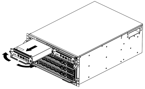 - 双手抓住模块左右两侧的助拔器向外翻转,使助拔器的头部脱离扩展槽。