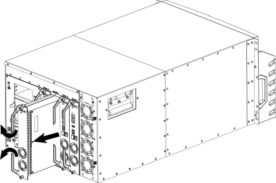 - 双手抓住模块左侧的两个助拔器向外翻转,使助拔器的头部脱离扩展槽。