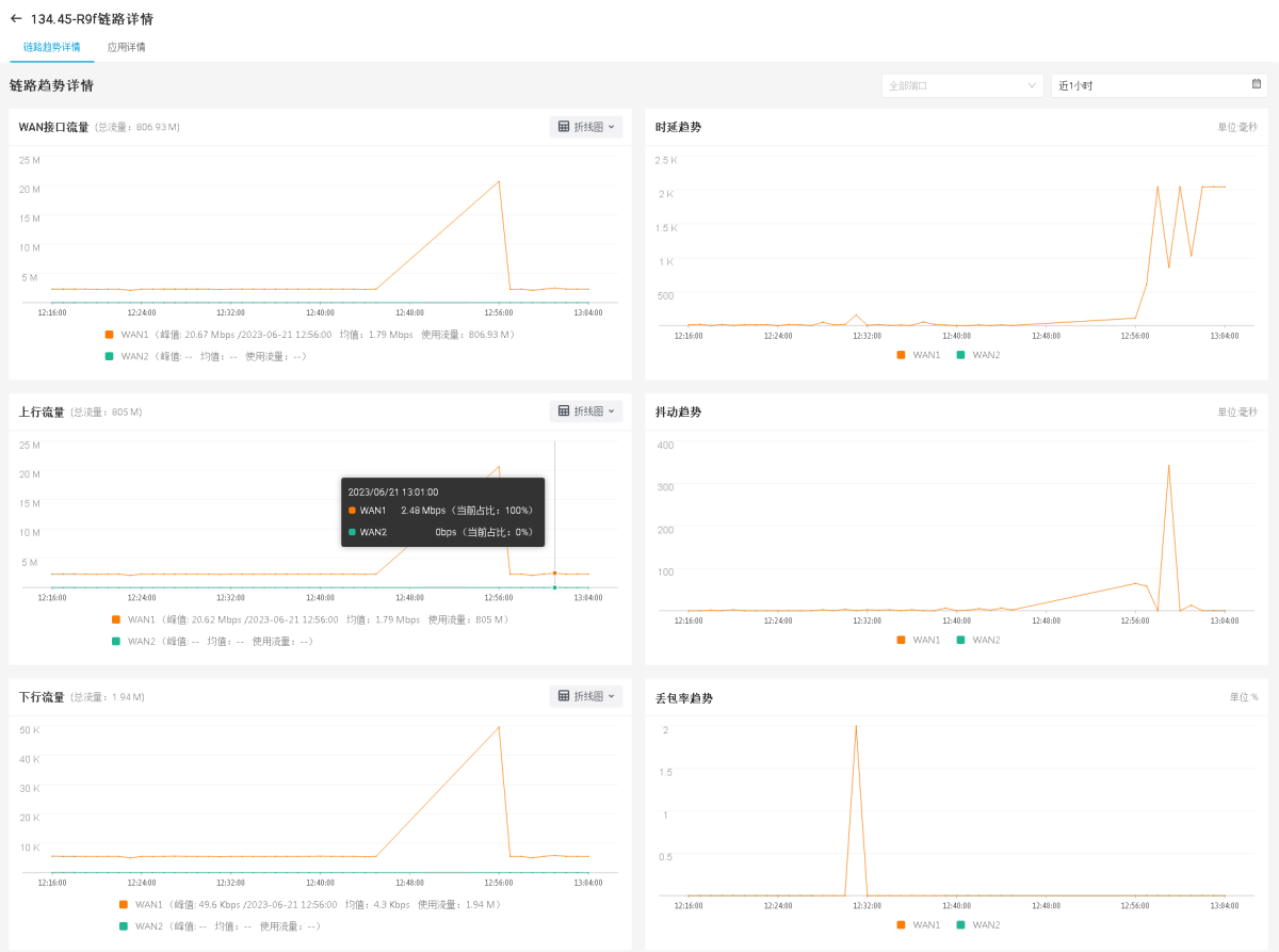 显示被管理设备的名称。点击设备名称,进入相应WAN口所在链路的详情页面。系统默认显示全部端口最近1小时的链路趋势详情,包括WAN接口流量趋势(指接口上下行总流量的趋势)、上行流量趋势、下行流量趋势、时延趋势、抖动趋势和丢包率趋势。 ![]()