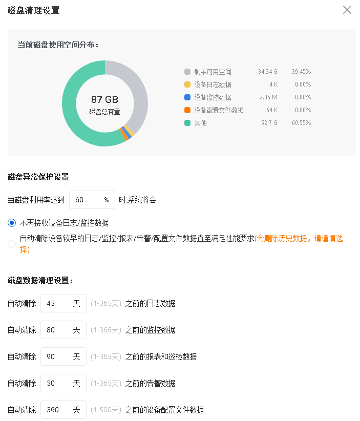 - 业务数据保存时间:用户通过配置磁盘各类存储数据的最大保存天数,定时清理超出数据保存时间范围内的数据,释放磁盘存储空间,避免因磁盘占用率过高导致系统无法正常运行的问题。