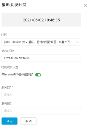 选项 说明 时区 在下拉菜单中选择需要的时区。如果选择的时区存在夏令时,系统会自动调整至夏令时时钟。 修改时间 在文本框中输入正确的时间和日期。 时间同步设置 与Internet时间服务器同步 点击“启用”按钮,并在服务器的文本框中指定NTP服务器的IP地址或域名,即通过与NTP服务器同步的方式配置HSM的系统时间。 - 点击“确定”,设备重启后重新登录即可。
