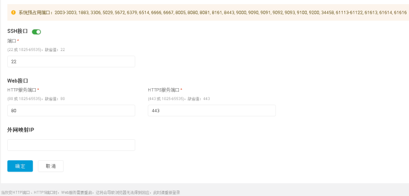 用户可以根据需要修改WEB访问端口号、配置SSH登录方式。配置系统的访问端口,请按照以下步骤进行操作: