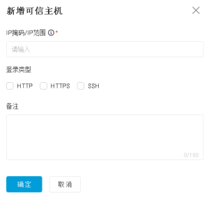 登录类型 选择可信主机的登录类型复选框。可信主机可以采用 HTTP、 HTTPS、SSH的方式登录。 备注 添加该可信主机条目的备注信息。 - 点击“确定”,新增可信主机并显示在可信主机列表中。