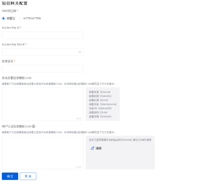 选项 说明 SMS供应商 指定短信网关类型,可选择阿里云和HTTP/HTTPS。 阿里云短信网关:当SMS供应商指定为阿里云时,配置以下参数。 Access Key ID 阿里云短信服务中申请的Access Key ID,作为山石网科设备和阿里云短信网关之间相互认证时的用户名。该参数需与在阿里云短信服务中申请的模板Access Key ID保持一致。取值范围1到128个字符。 Access Key Secret 阿里云短信服务中申请的Access Key Secret,作为山石网科设备和阿里云短信网关之间相互认证时的密码。该参数需与在阿里云短信服务中申请的模板Access Key Secret保持一致。取值范围1到128个字符。 短信签名 指定在阿里云短信服务中申请的短信签名,以显示在短信内容中。取值范围2到12个字符。 系统告警短信模板Code 复制灰色文本框内的告警短信模板至阿里云短信服务平台,由阿里云短信服务平台进行审核。审核通过后, 将得到的模板Code填入文本框内。 用户认证短信模板Code 复制灰色文本框内的认证短信模板至阿里云短信服务平台,由阿里云短信服务平台进行审核。审核通过后,将得到的模板Code填入文本框内。