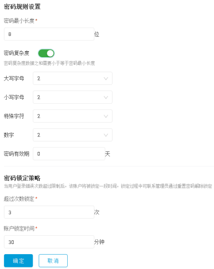 系统支持配置用户登录密码的复杂度,包括密码的最小长度及复杂度。同时,支持配置密码的锁定策略,即允许账户登录失败的最大次数以及超出允许登录失败的最大次数后账户的锁定时间。