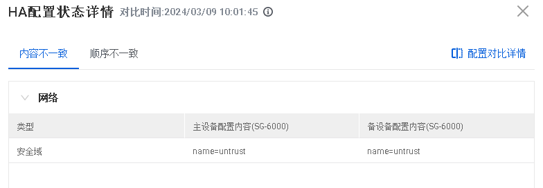 - 查看HA设备当前配置信息的对比详情:在<HA配置状态详情>页面,点击“配置对比详情”按钮,查看主/备设备当前配置信息不一致的情况。