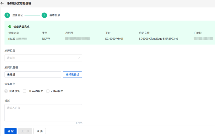 选项 说明 地理位置 指定设备的地理位置。 所属设备组 指定设备所属设备组。 设备角色 说明:不支持将NIPS设备、NIDS设备、IFW设备(工业防火墙)和IDA设备(工控安全监测审计系统)设置为“SD-WAN网关”或“ZTNA网关”。 描述 为该设备添加相关的描述信息,取值范围0到255个字符。 若初始化失败,在弹出的提示框内,系统将在初始化失败的步骤前给出“X”的提示。