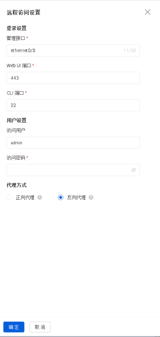 按钮,打开<远程访问设置>页面。 - 编辑设备的远程登录配置,点击“确定”按钮,完成配置。