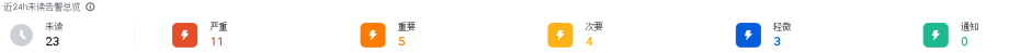 在<告警消息>标签页的上方,系统向用户展示最近24小时内,不同级别未读告警的数量分布。查看最近24h未读告警总览,请按照以下步骤进行操作: