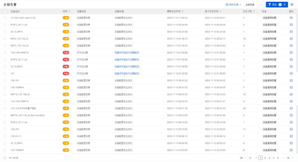 - 对于同一台设备,如匹配指定告警规则可以产生告警信息,若在7天内该告警信息一直未读,且未产生与该规则匹配的新告警,则将该条未读告警信息置为已读状态。
