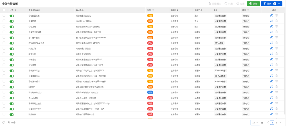 来源 显示满足指定规则的告警信息产生的来源,包含系统告警、设备通用告警、SD-WAN告警、ZTNA告警。 类型 显示告警规则的类型,包含预定义和自定义。 - 当显示为“预定义”时,表示告警规则为系统预定义告警规则,仅支持编辑。