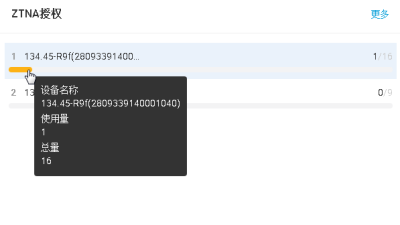 显示当前在线ZTNA设备的授权数量,包括授权总数以及当前已接入的用户数量。当ZTNA设备的当前接入用户数占授权总数的90%时,系统将在该设备名称前给出