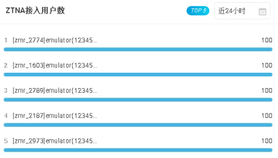 显示指定统计周期内(默认周期为近24小时)ZTNA用户接入数量排名前五的ZTNA设备名称及其接入的ZTNA用户数。