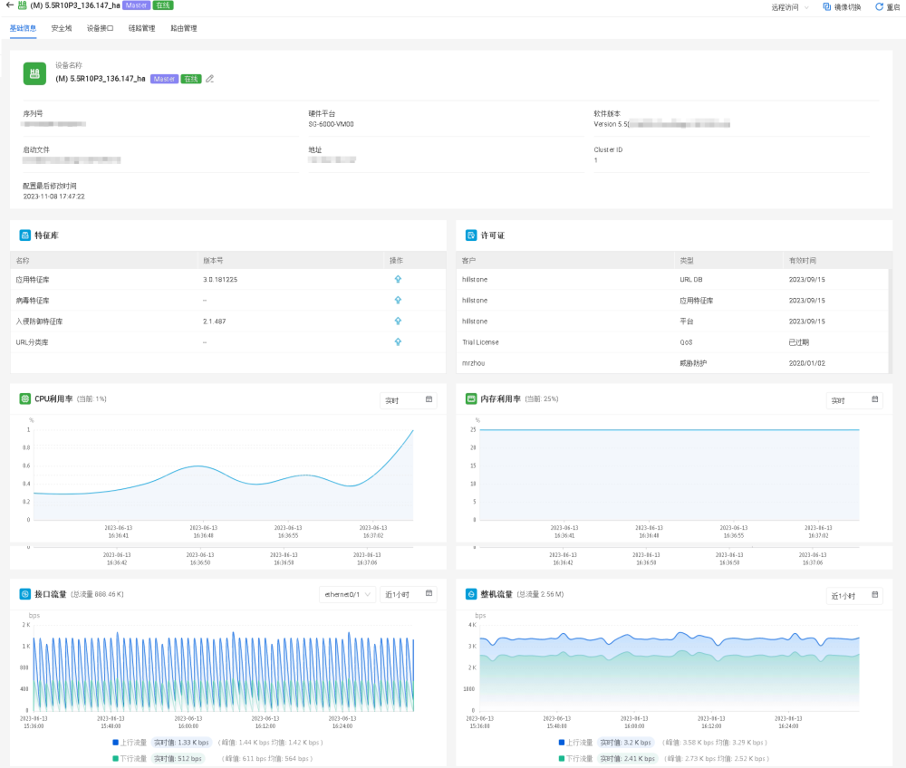 用户可以在基础信息页面查看ZTNA网关设备的基本信息,包括设备信息、特征库信息、许可证信息、CPU利用率、内存利用率、并发连接数、新建连接数、接口流量、整机流量。