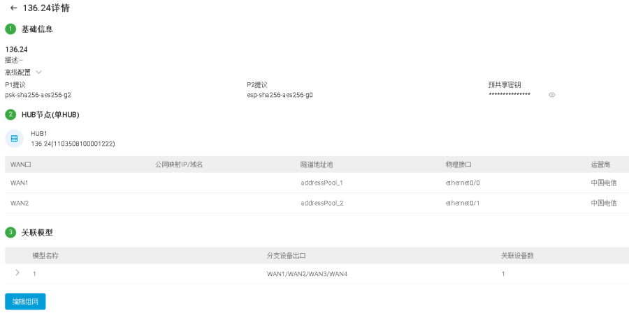 按钮,或点击星型网络详情页的“编辑组网”,对该星型网络的相关参数进行修改,可以修改其高级配置、增加HUB节点WAN口等。 - 点击“操作”列的