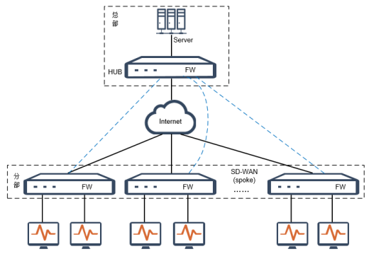 典型的VPN星型网络拓扑图如下所示,与总部业务服务器直接相连的山石网科防火墙设备称为中心设备(HUB设备),分部的山石网科防火墙设备称为分支设备(ZTP设备)。VPN星型网络搭建完成后,各分支设备端的PC可以通过VPN隧道对总部的业务服务器进行安全访问。