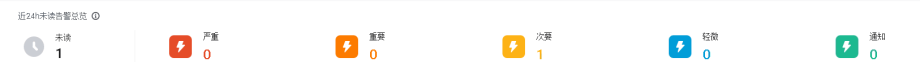 - 近24小时未读告警总览:在“近24h未读告警总览”区域,查看最近24小时内不同级别未读告警的数量分布,包括:未读告警数量、严重级别的告警数量、重要级别的告警数量、次要级别的告警数量、轻微级别的告警数量和通知级别的告警数量。