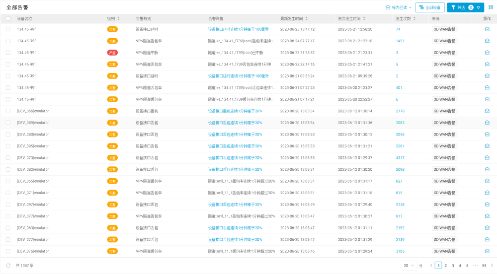 说明:未读告警数量等于严重、重要、次要、轻微以及通知级别的告警数量的总和。 - 全部告警:在“全部告警”区域,以列表的形式展示SD-WAN告警的详细信息。