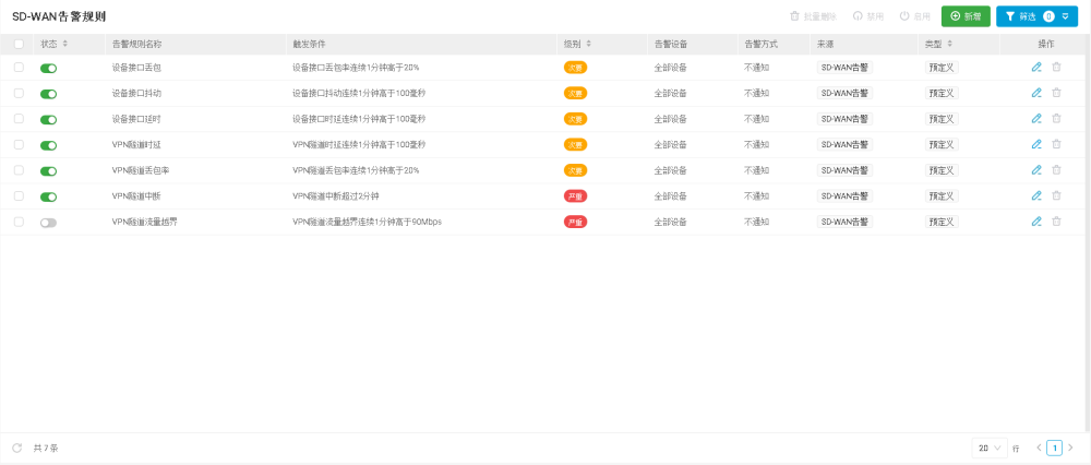 用户可以创建自定义SD-WAN告警规则,也可以编辑、删除已创建的自定义SD-WAN告警规则。