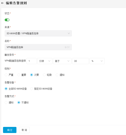 选项 说明 状态 点击“启用”按钮,启用或禁用SD-WAN告警规则,默认为启用状态。 来源 选择SD-WAN告警产生的来源,包括: 设备接口延时、设备接口抖动、设备接口丢包、VPN隧道流量越界、VPN隧道中断、VPN隧道丢包率和VPN隧道时延,默认为VPN隧道流量越界。 名称 输入SD-WAN告警规则的名称,最多可输入31个字符。 触发条件 配置产生SD-WAN告警规则需要的条件。当SD-WAN设备接口的运行状况或VPN隧道状况满足触发条件时,系统将根据配置的“级别”,产生指定级别的告警信息。SD-WAN设备告警的触发条件包括以下7项:设备接口延时、设备接口抖动、设备接口丢包、VPN隧道流量越界、VPN隧道中断、VPN隧道丢包率和VPN隧道时延。其相关配置规则如下: - 设备接口延时、设备接口抖动、设备接口丢包、VPN隧道流量越界、VPN隧道丢包率和VPN隧道时延的配置规则如下: