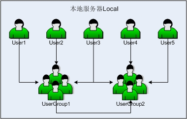 如上图所示,用户User1、User2和User3均属于用户组UserGroup1,而User3又同时属于用户组UserGroup2,UserGroup2中还包含User4、User5以及用户组UserGroup1。