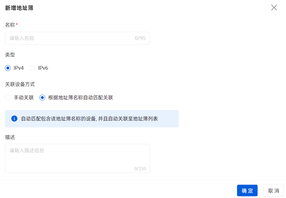 选项 说明 名称 指定地址簿的名称。该名称需要与被管理设备端的地址簿名称相同。最多可输入95字符。 类型 指定IP的地址类型,可选择IPv4或IPv6。默认为IPv4。 描述 添加地址簿的描述信息。 - 点击“确定”,完成配置。