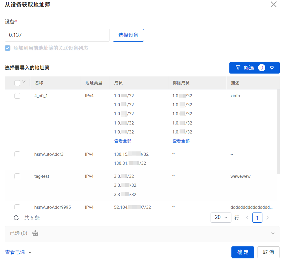 - 点击“选择设备”,在打开的<选择设备>页面中,勾选指定设备并点击“确定”按钮,系统会自动获取该设备所有自定义的无序地址簿,并展示在页面下方的表格中。