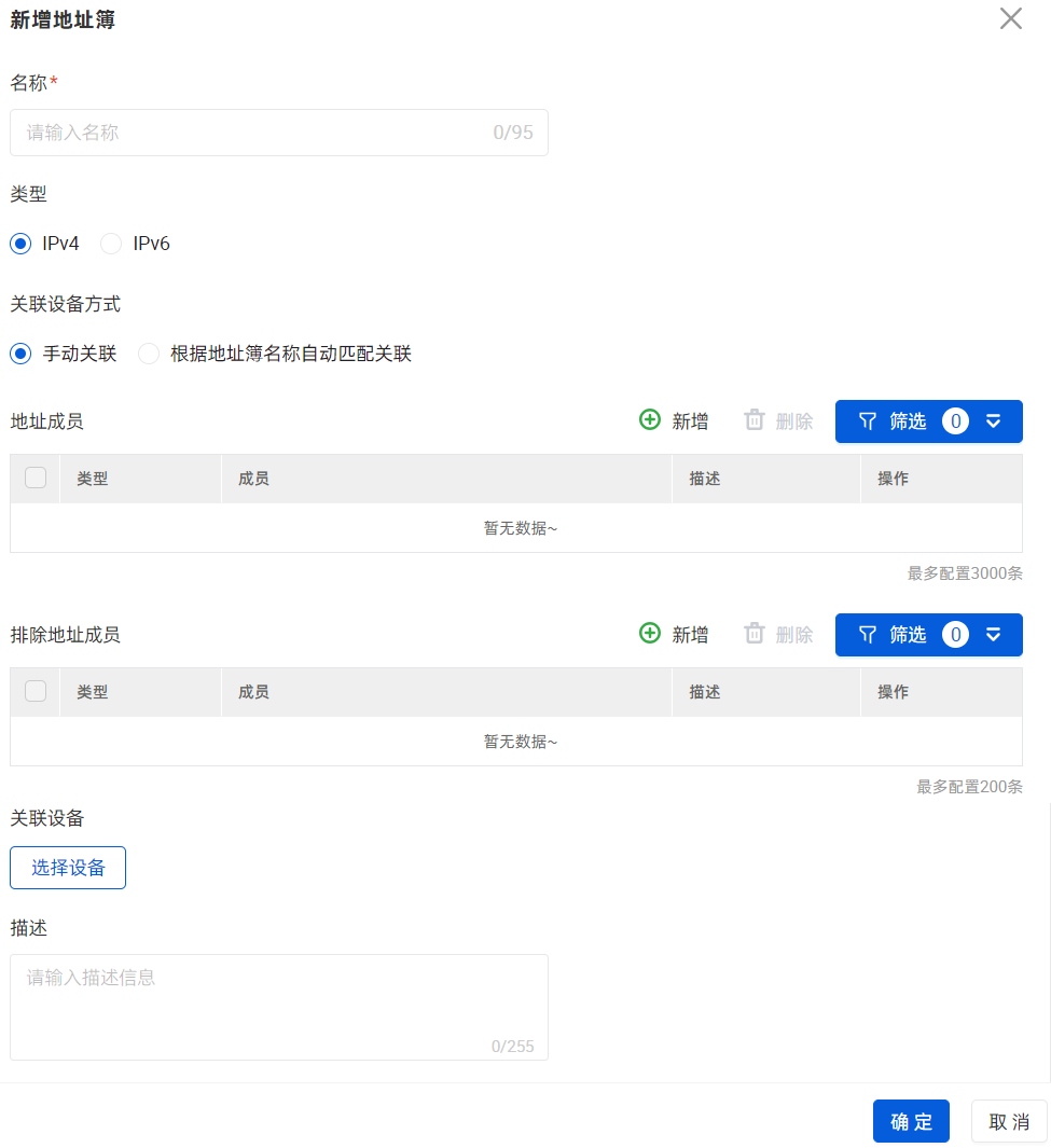 按钮,在打开的<编辑地址簿>页面,修改地址成员、排除地址成员和描述信息。 - 点击“确定”,完成配置。若编辑的手动关联地址簿已关联设备,那么在完成配置后,系统会自动将该地址簿的配置变更下发到关联的被管理设备。